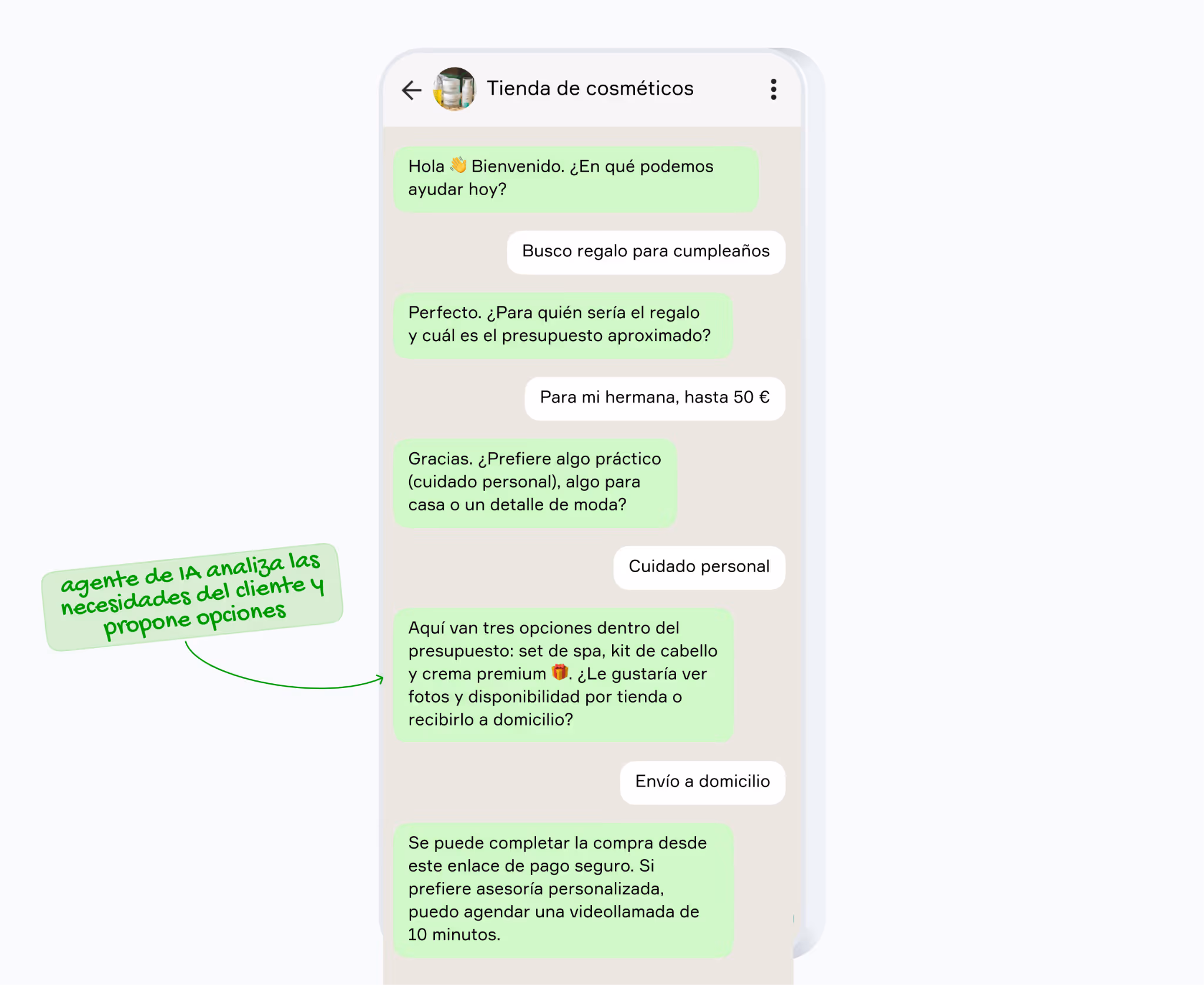 <span class="text-bg-yellow">En conjunto, estos agentes operan como una cadena coordinada: el de bienvenida califica, el de producto facilita la elección, el de postventa cuida la experiencia y el de retención mantiene viva la relación con el cliente.</span> El negocio obtiene menos fricción en cada paso, más eficiencia operativa y una interfaz que aprende con cada conversación.