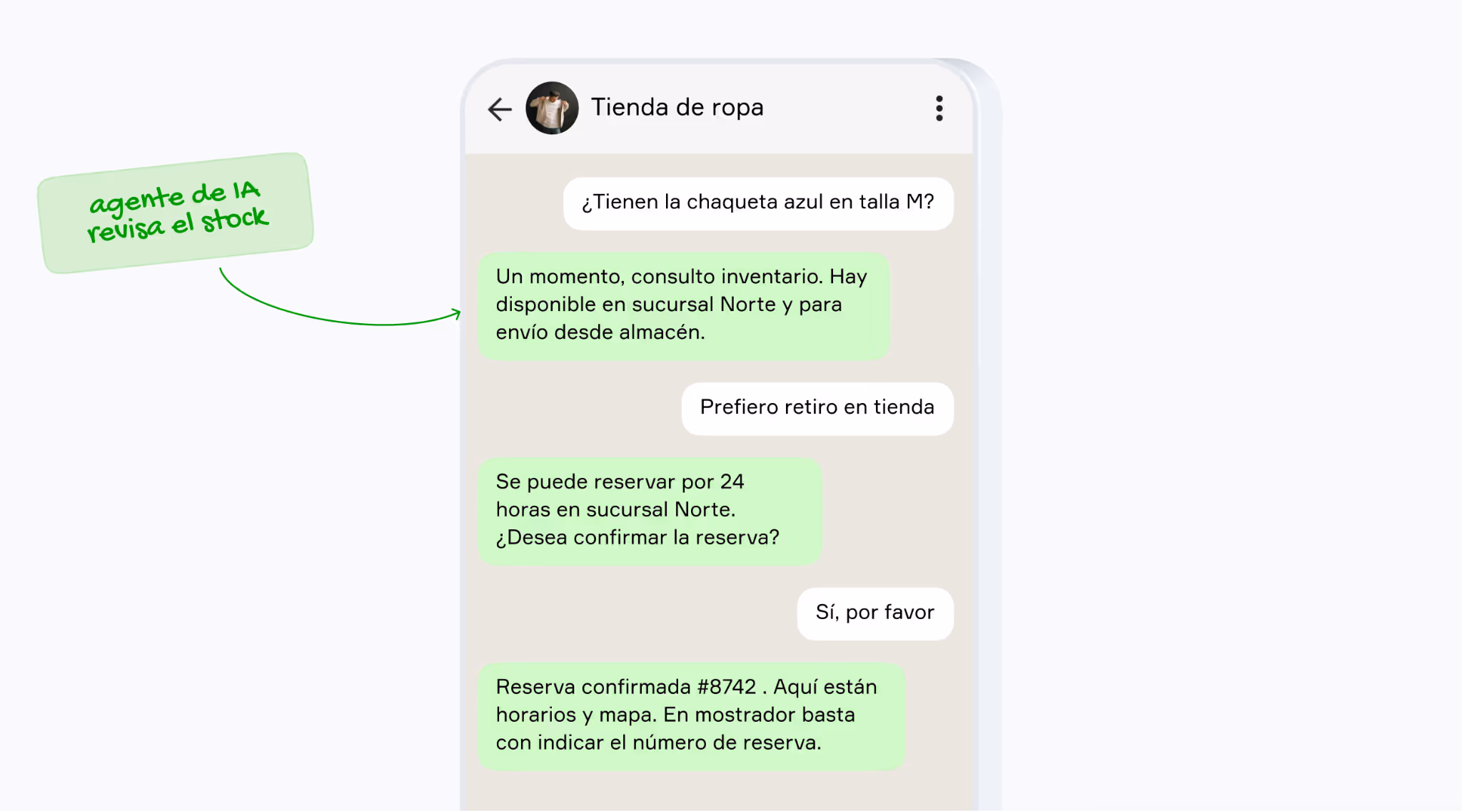 Este agente está diseñado para resolver dudas sobre producto y disponibilidad, consultar catálogo e inventario por canal y tienda, recomendar talla según el historial y ofrecer alternativas equivalentes cuando no hay stock. También puede generar una reserva y dejar la nota en el CRM para que el equipo la confirme sin salir del chat.