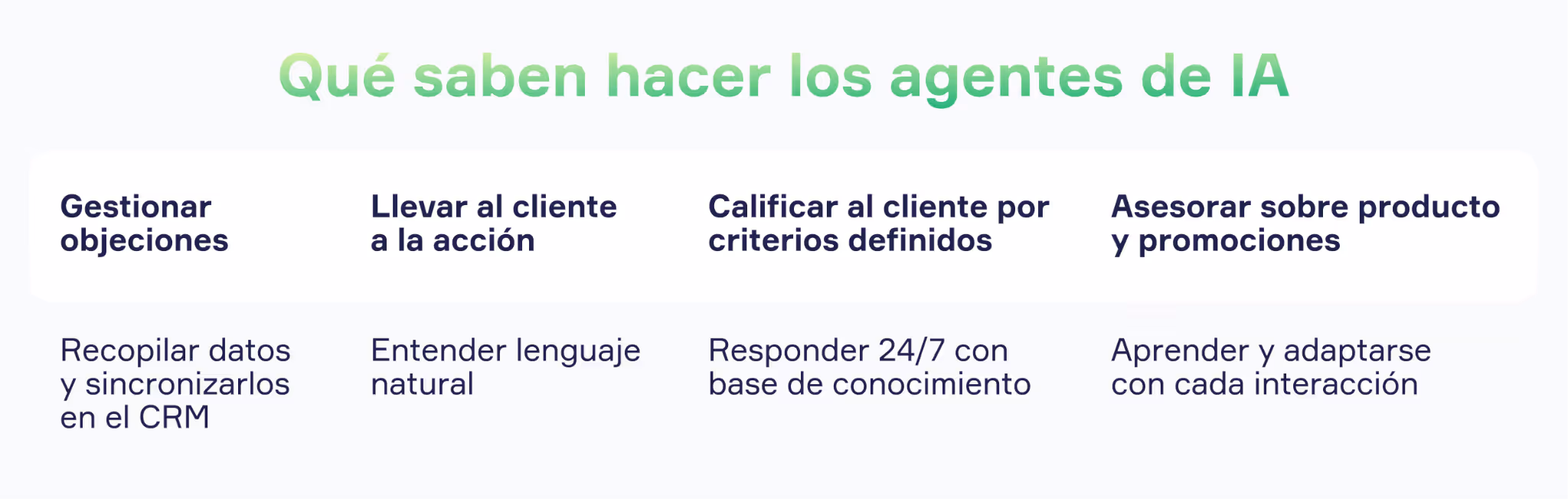 <span class="text-bg-yellow">Los agentes de IA elevan la productividad al quitar rutina, permiten una atención 24/7 con respuestas consistentes y, al sumar personalización y analítica a los procesos, impulsan la generación de leads.</span> Estos son sus principales beneficios: