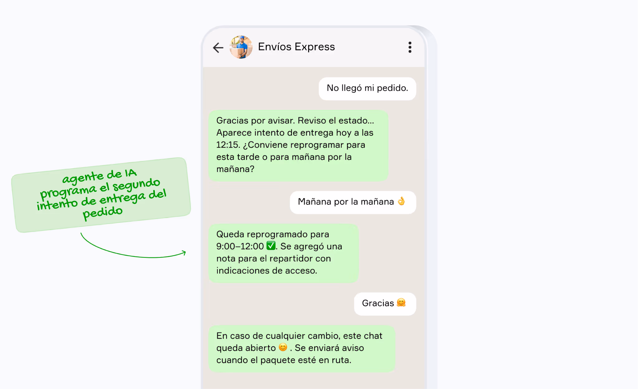Después actúa. Responde con instrucciones claras, actualiza el CRM, crea o cierra un ticket, reserva un producto, programa una recogida o inicia un cobro, todo dentro del mismo flujo. Si detecta que la situación requiere a una persona, escala la conversación con un resumen útil —qué ocurrió, qué pasos ya se realizaron y cuál sería la siguiente mejor acción—, reduciendo idas y vueltas.