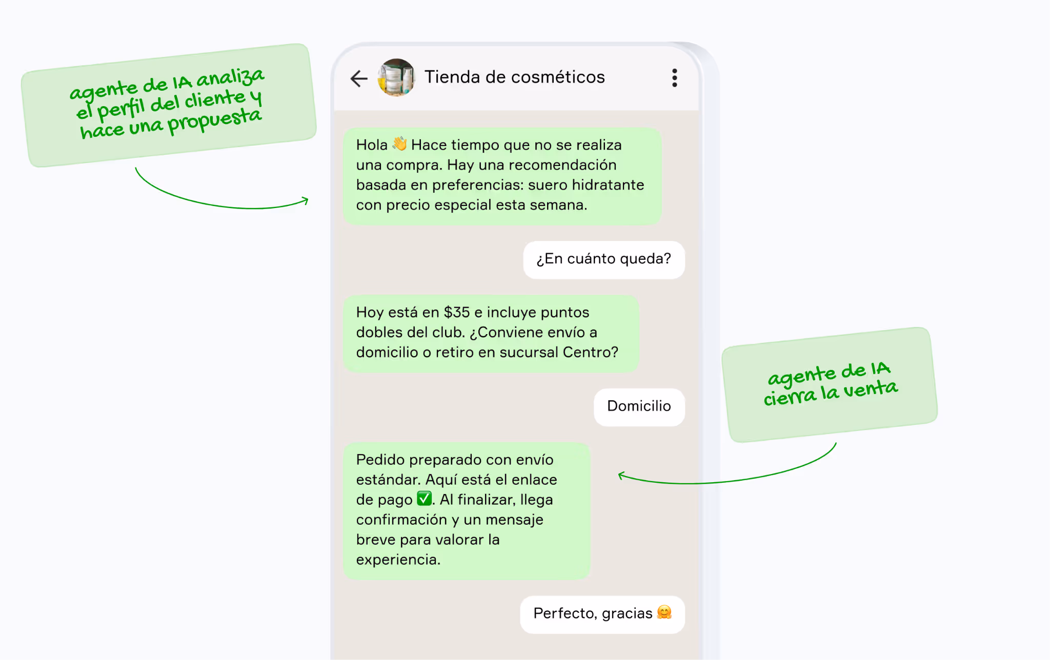 Productividad. Al automatizar tareas repetitivas, el equipo puede concentrarse en trabajo creativo y estratégico. Por ejemplo, en un e-commerce de alimentos, un agente detecta mensajes como “quiero lo de siempre”, identifica al cliente en el CRM, arma el pedido habitual, aplica el cupón vigente, crea el borrador de la factura y envía el enlace de pago. El equipo solo revisa cambios o excepciones.