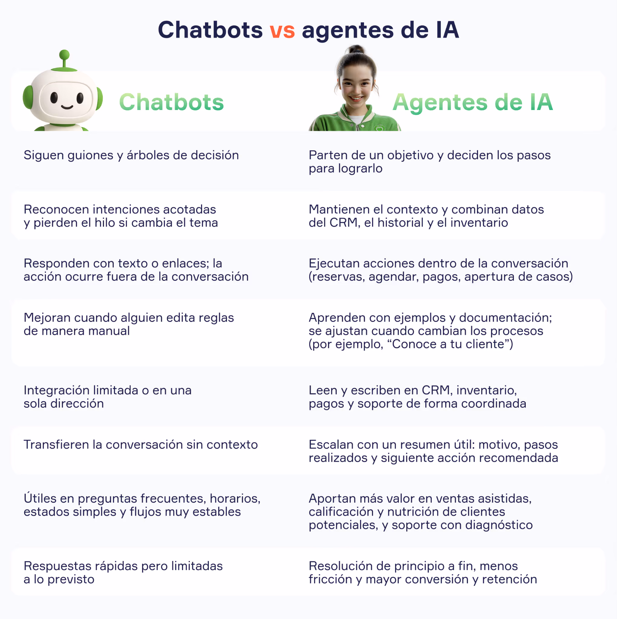 El chatbot vive de guiones y botones mientras que el agente de IA entiende el contexto, decide qué hacer y lo hace