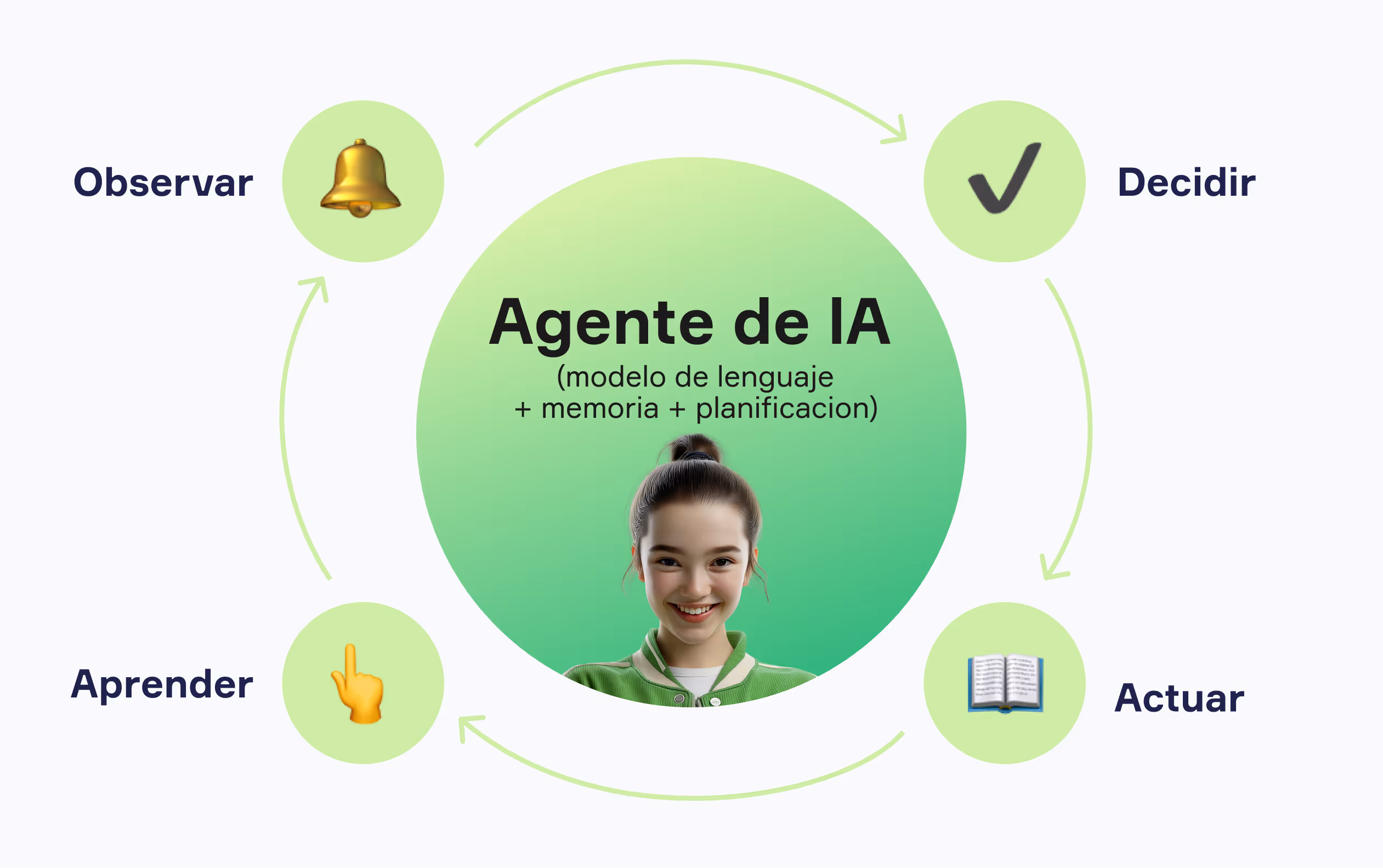 ¿Cómo funciona paso a paso? Sigue un ciclo: observar, decidir, actuar y aprender. Reúne señales (mensajes, historial, inventario), elige la mejor acción, la ejecuta y luego ajusta su comportamiento según resultados. Todo ocurre con límites definidos por el equipo: objetivos, permisos y reglas de escalamiento.