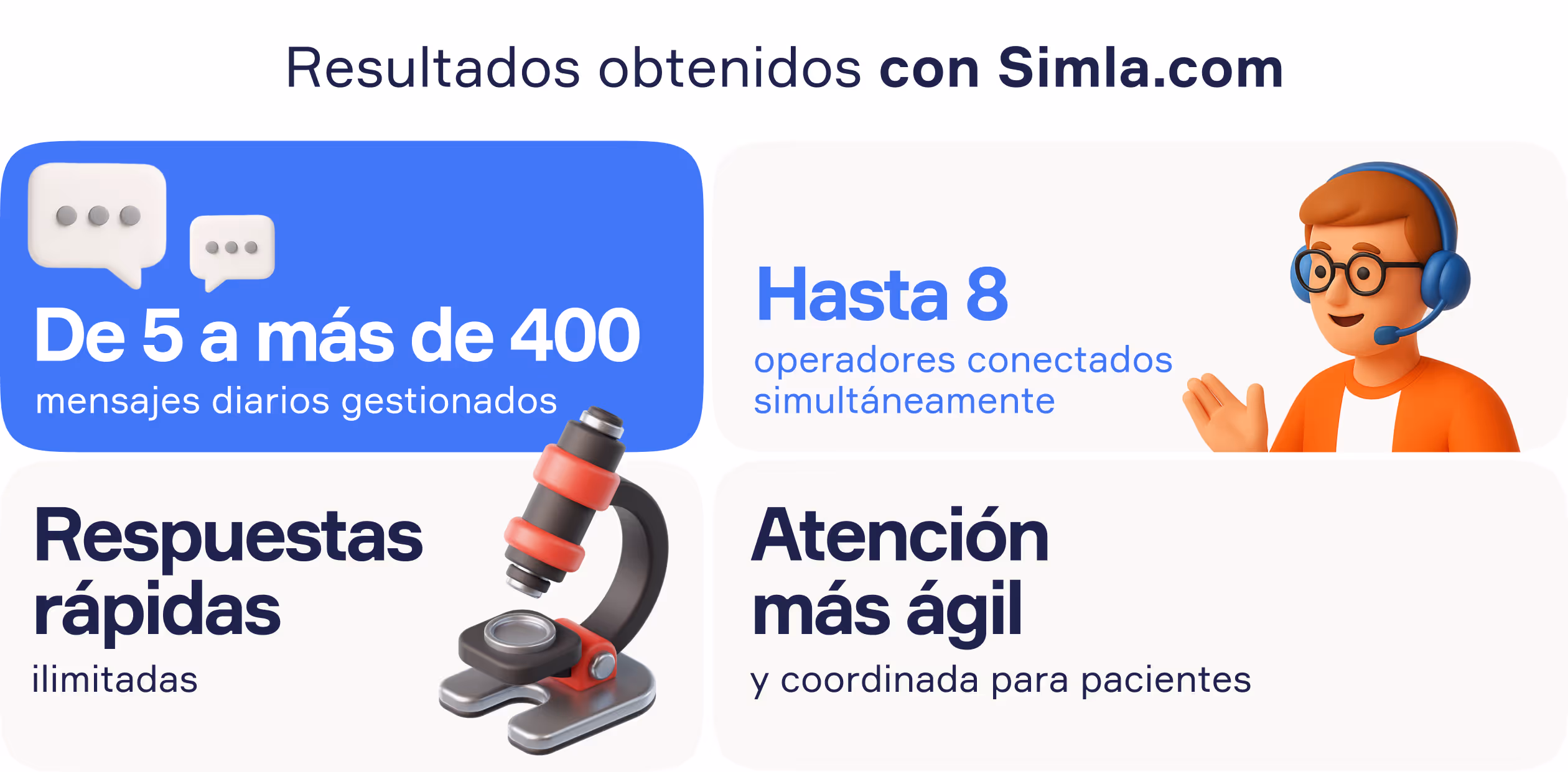 Con la implementación de Simla.com y su integración con la API de WhatsApp, el laboratorio transformó por completo su gestión. Ahora, hasta ocho operadores por turno pueden conectarse simultáneamente, acceder al historial de conversaciones y apoyarse mutuamente en la atención al paciente. Además, cuentan con respuestas rápidas ilimitadas, lo que agiliza la comunicación y asegura consistencia en los mensajes.