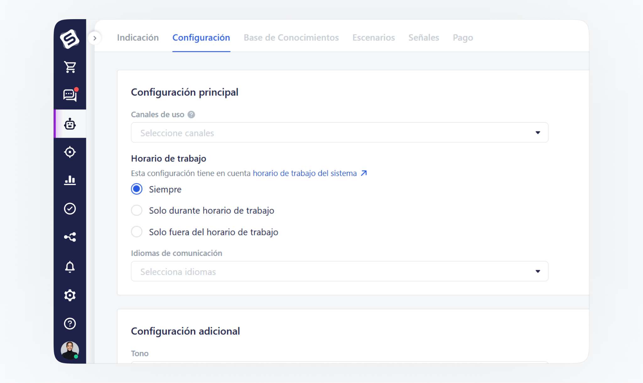 Una vez definido dónde y cuándo opera el agente, el siguiente paso es ajustar cómo se comunica y cómo da seguimiento a las conversaciones. En Simla.com, esto se hace desde la sección de configuración adicional. Aquí no se trata solo de elegir opciones como tono o longitud de respuesta, sino de definir cómo se quiere que se sienta la interacción con el cliente.