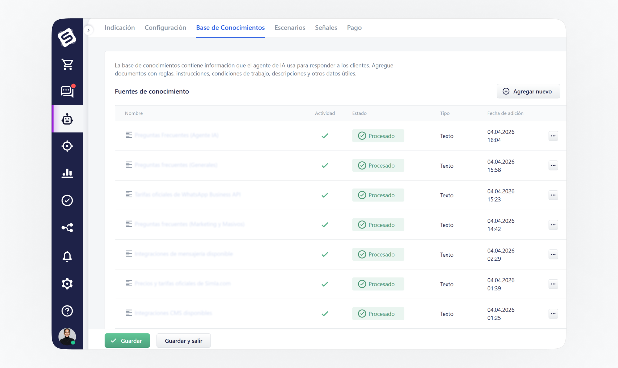 Este es uno de los pasos más importantes. Un agente puede tener buen tono, buenas reglas y buena lógica, pero si no tiene información confiable, tarde o temprano va a quedarse corto. La base de conocimientos funciona como la fuente de información que el agente usará para responder. Aquí conviene subir documentos que realmente representen cómo opera el negocio: políticas, condiciones de servicio, catálogo, preguntas frecuentes, procesos internos, descripciones y cualquier otra referencia útil.