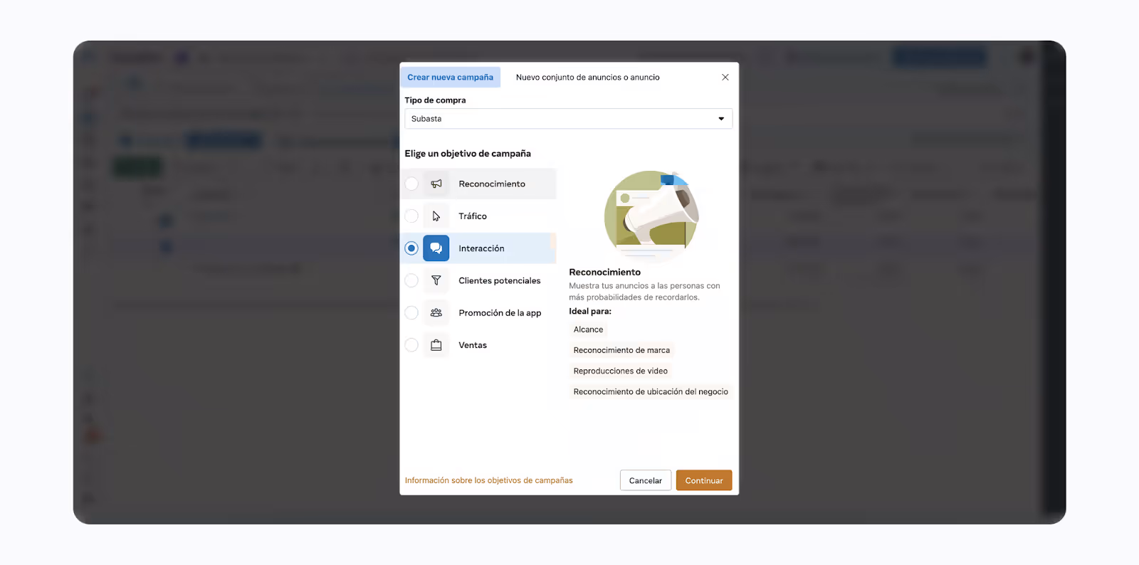 Solo tres objetivos permiten usar WhatsApp como CTA: interacción, tráfico y ventas. Aquí te explicamos cómo configurar una campaña con el objetivo Interacción, ya que incluye subobjetivos como Mensajes, Reproducciones y Conversiones. Así, te servirá si quieres a la misma vez cerrar la venta e involucrar a tus leads.